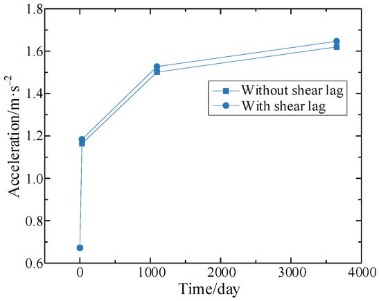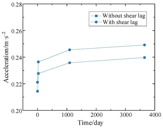 Maximum vertical accelerations of the train body with and without considering the shear lag with operation time.