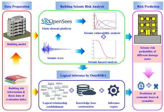 Based on an extensive literature review, it is paramount to develop an efficient building seismic risk prediction framework based on probability and ontology to predict economic losses and casualties for better disaster prevention and mitigation. This paper aims to develop an ontology-based probabilistic framework for seismic risk assessment of buildings. In the developed framework, seismic risk probabilities of buildings with different damage states are first derived based on seismic vulnerability analysis and seismic hazard analysis. On this basis, an Ontology for Building Seismic Risk Assessment (OntoBSRA) system is developed to integrate knowledge on seismic risk assessments of buildings into a unified knowledge base by combining ontology and semantic web rule language (SWRL). Thus, automated seismic risk prediction including direct losses, indirect losses, and casualties related to buildings with various purposes and different damage states can be realized. The flow chart of the seismic risk prediction framework is shown in Figure 1. In addition, a case study is conducted in order to illustrate the application of the framework for seismic risk prediction.