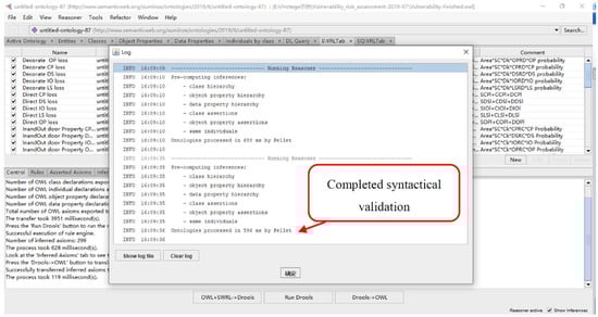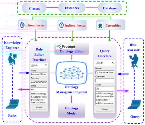 The developed OntoBSRA includes a knowledge base, ontology management system, rule editor, and query function. The ontology knowledge base stores all seismic risk-related knowledge in the form of an Ontology Web Language (OWL) file, which plays an important role in the OntoBSRA. The ontology management system provides the rule-editing function, which can achieve the deductive reasoning ability of the developed ontology, and has the function of creating as well as updating the ontology. Moreover, users can obtain the final reasoning results by editing the query language rules, (such as the simple protocol and RDF query language (SPAQRL) and the semantic query-enhanced web rule language (SQWRL), using the query function according to their demands []. In addition, as Protégé software [] can realize the establishment of classes, logical relationships, attributes, and instances as well as provide the SWRLTab and SQWRLQueryTab interfaces for SWRL and SQWRL editing, respectively, the OntoBSRA proposed in this paper was developed based on Protégé. The schematic diagram of the OntoBSRA system is shown in Figure 2.