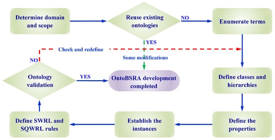 The methods used for developing the ontology include the Uschold and King method, the Gruninger and Fox method, the Methontology method, the KACTUS method, and the Ontology Development 101 method []. In this paper, the Ontology Development 101 method is employed, as shown in Figure 3. According to this method, new ontologies can be developed using the Protégé software by following specified steps or reusing the existing semantic resources and ontologies. The steps for developing the OntoBSRA are explained in details below.