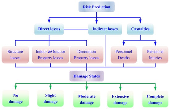 Seismic risk prediction of a building mainly includes direct losses, indirect losses, and casualties, among which direct losses include structural losses, indoor and outdoor property losses, and decoration property losses.