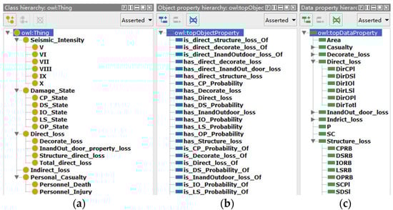 Defining the classes and class hierarchies is the primary stage in the process of developing an ontology. In this paper, a top-down method is adopted to define the classes. The superclasses for seismic intensities, damage states, direct losses, indirect losses, casualties, etc., are first created. Each superclass is then refined to establish subclasses. The specific details are shown in Figure 5a.