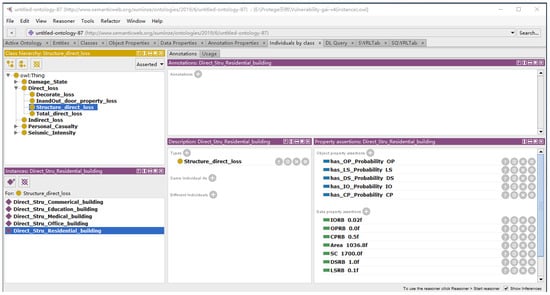 The instances in the classes have their own locations and hierarchies, and the object property and data property of instances must be defined in OntoBSRA. In OntoBSRA, different building types such as residential buildings, medical buildings, commercial buildings, office buildings, and educational buildings are established as instances in the classes. The basic data, such as loss ratios and casualty rates, are manually input in the established instances, while the evaluation indices, such as direct losses and casualties, need to be inferred by the inference machine using the SWRL rules. Figure 6 shows the instances in the class of the structural losses.