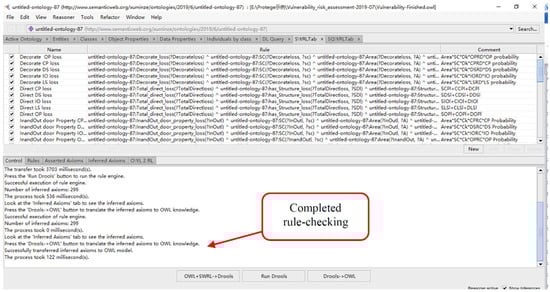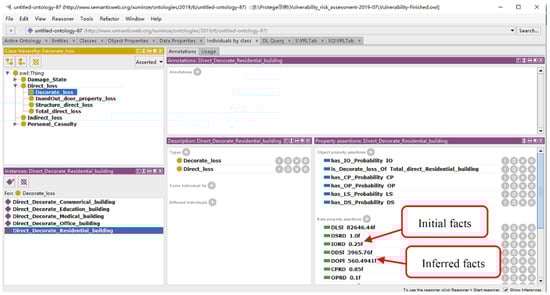 The seismic risk probabilities obtained from the analysis in Section 4.1 were manually input into the OntoBSRA, and new facts were generated by running the pre-set SWRL rules. The main SWRL rules based on the evaluation index equation in Section 3.2 are shown in Table 11. Taking the decoration property losses as an example, the new facts shown in Figure 12 were deduced by running the pre-set SWRL rules, thus validating the correction of syntax and SWRL rules for decoration property losses.