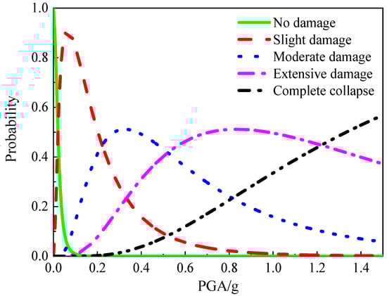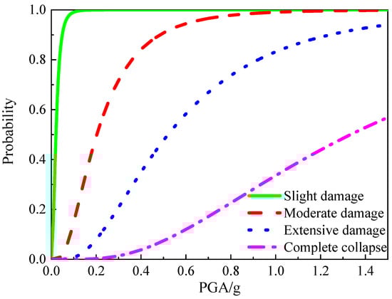 where Pf is the probability of the limit being exceeded, DI is the damage state thresholds, and and are the logarithmic standard deviations of the engineering demand parameter and the seismic capacity, respectively. According to literature [], when the ground peak acceleration PGA is selected as the IM, is equal to 0.5.