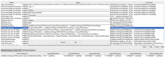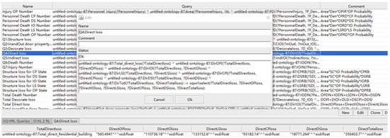 Moreover, the specialized assessment results can be queried using the SQWRL rules according to the user’s demand. Table 12 shows the SQWRL querying command for the assessment indicators of the OntoBSRA. In the application of the OntoBSRA, if the users/stakeholders attach importance to the economic losses (such as direct losses), the assessment results can be obtained by running the pre-set SQWRL rule Q4 in Table 12. The querying results are illustrated in Figure 13. Furthermore, if users/stakeholders pay more attention to the casualties, they can run the SQWRL rules Q6 and Q7 to obtain the assessment results. The querying results of the number of injuries is shown in Figure 14. It can be seen from Figure 13 and Figure 14 that the OntoBSRA system can provide the total economic losses or casualties as well as the related assessment indicators of buildings in different damage states. This function can assist engineers, provide guidance on earthquake hazard mitigation, and improve efficiency in decision-making.