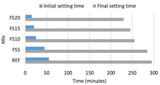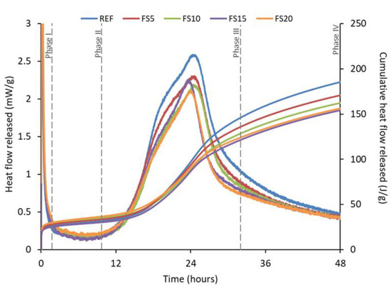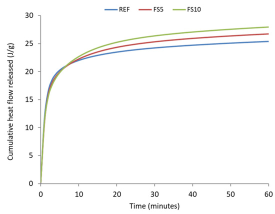 - Isothermal calorimetry showed that tested cement pastes with and without flash-calcined sediment presented similar calorimetric curves with identical phases. The addition of flash-calcined sediment did not majorly affect the hydration process of the pastes. However, the cumulative heat of hydration within the first hour showed that FS10 had the shortest setting time, followed by FS5, then REF, which complied with the results obtained by the Vicat test.