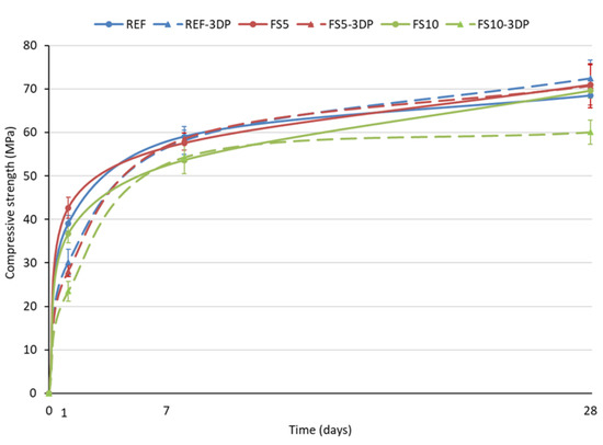 - Printed samples recorded an equal to lower compressive strength than that of nonprinted samples, due to a larger porosity associated with the placement technique, as printed samples were laid down layer by layer without any compaction, whereas nonprinted samples were compacted during placement, eliminating the higher porosity.
