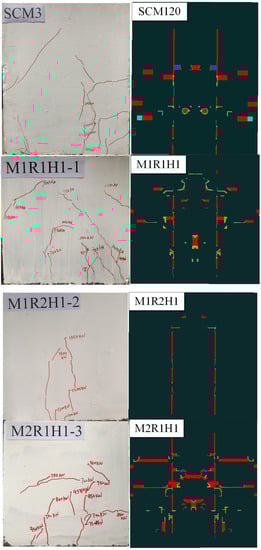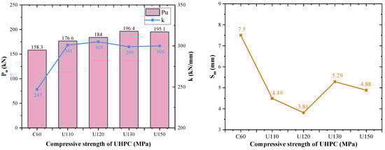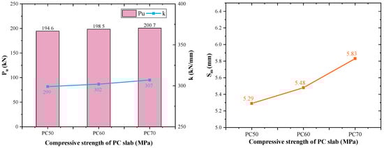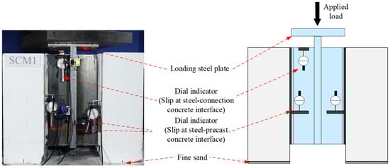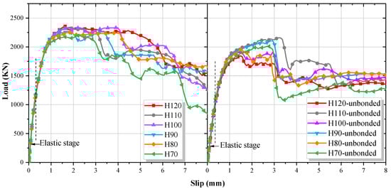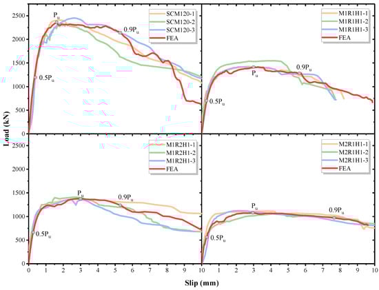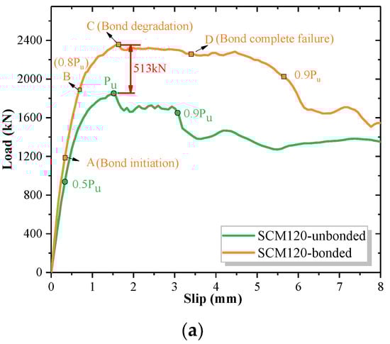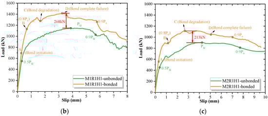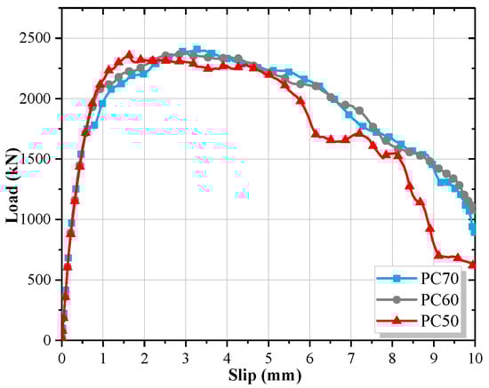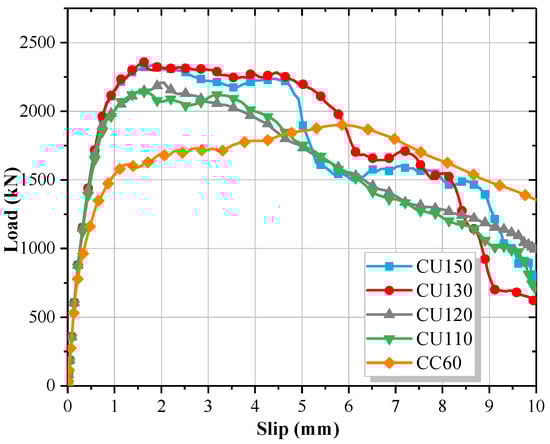 - The bond of the steel–concrete interface significantly improved the shear bearing capacity and elastic shear stiffness of push-out specimens due to a larger steel–concrete interface in PCSC connectors than in conventional stud connectors. Specifically, the steel–UHPC interface and the steel–HSM interface increased the shear bearing capacity of the specimens by approximately 25% and 20%, respectively. However, the steel–HSM interface showed damage earlier than the steel–UHPC interface.