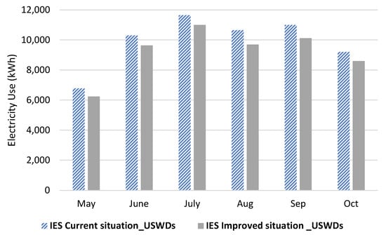 - IES-VE predicted that the total electricity consumption during the summer, using the USWD of the base case, was 595 MWh, whereas the energy simulation with the USWD of the amended scenario was 552 MWh, a reduction of 7.25% in total energy; in a similar study in Chicago, it was found that using a local weather dataset led to a 4.7% difference in cooling energy use compared to TMY weather data [22];