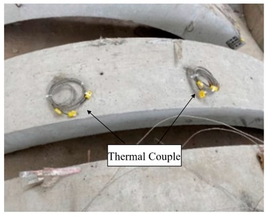 Due to the long and narrow special structure of tunnels, the current research on the temperature field of tunnels mostly focuses on the high-temperature area of the arch crown and its longitudinal heat attenuation. However, there are few temperature tests on the vertical cross sections of the tunnel lining structure. For the core damage area, the uneven temperature on the cross section of the tunnel will cause high-temperature stress and eventually lead to structural instability and failure. In order to monitor the temperature distribution at different parts of the concrete lining arch, thermocouples were embedded in advance (shown in Figure 3). 4 pieces of full size concrete lining structure were hoist and sealed over the top of the open-hearth furnace (Figure 4). In this way, the temperatures of different parts and different levels of concrete can be monitored during the process of the combustion experiments.
