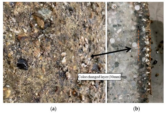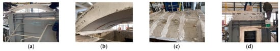 The surface color of the concrete structure changed due to the high temperature (Figure 9). The final color of the heating surface (880 °C) at the vault was grayish white and yellow, with cracks on the surface, and there was no pulverization (Figure 8). After the RABT-curve combustion, the thickness of the color change at the center of the arch was about 30 mm, and the surface also fell off during cutting. The rest of the concrete lining structures were ready for the drop-weight-impact test.