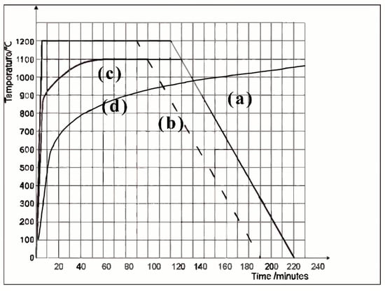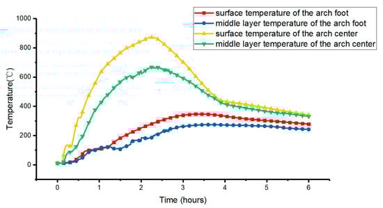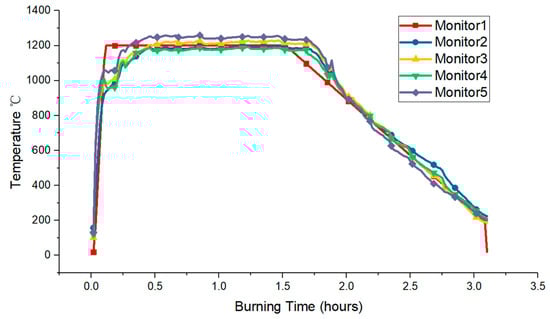 After the burning experiment was complete, the temperature data inside the furnace were collected, and the temperature–time curve is shown in Figure 6.