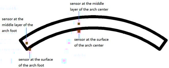 In this experiment, the thermocouples were embedded in the vault foot, arch foot, and arch center of the lining structure. Temperature data were collected by a multichannel acquisition instrument, and the location of the thermal sensor is shown in Figure 7. These data were helpful for us when analyzing the temperature of the critical area of the concrete lining arch structure.
