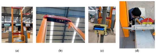 In order to store more energy, two high-elastic-modulus springs were built into the left and right main columns of the test frame. When the falling weight is lifted, the additional elastic potential energy can be accumulated by these two springs. In this way, the impact kinetic energy can be effectively increased through the conversion of the elastic potential energy at a limited laboratory height, which improved the feasibility for the indoor explosion-impact experiment. The counterweight can be adjusted to set the proper impact strength. From the perspective of safety, a locking device was installed to prevent unexpected dropping. Moreover, the control switch of the dropping weight was integrated on the movable platform.