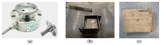 The concrete block that we used in this experiment was a standard concrete test block poured in advance (150 mm × 150 mm × 150 mm, fcu = 30 Mpa). When repeating the experiment procedure, the impact-force sensor (Figure 11a) was installed under the concrete test block to obtain the time–history curve of the impact. In order to increase the overall stiffness of the concrete test block and provide the confining pressure, the concrete test blocks were surrounded by a 3 mm-thick steel plate (Figure 11b). The impact area can be obtained by measuring the depression area of the concrete test block. After measurement, the impact depression area was 0.05 m2 (Figure 11c). The impact process was analyzed by the momentum impulse conservation. According to the speed of the falling hammer, the initial momentum of the falling hammer can be calculated. In the experiment, the loading frame was controlled by an electromagnetic switch and fell freely. After more than 2 m, the spring in the loading frame began to intervene and accumulate the elastic potential energy. Therefore, two different falling heights of 2 m and 3 m were selected to generate the different impact energies in this experiment. Before the impact started, the sensor was fixed on the base and an aluminum alloy plate was placed in the middle. After the drop weight hit the sensor, the load was collected by the dynamic-signal analyzer, and the data were recorded after all the experiments were finished (Table 2).