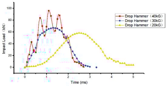 The initial momentum can be calculated according to the speed of the falling impact of the loading frame; the impulse can be calculated by integrating the time–history curve of the impact load (Figure 12). In the impact process, the momentum was less than the impulse, and so it could be inferred that, although the experimental frame with a rigid foundation was adopted, the loading frame had a certain degree of rebound in the impact process of up to 40 kg.