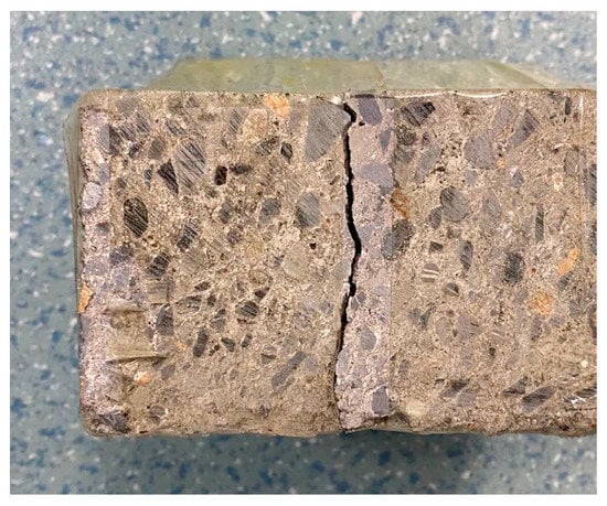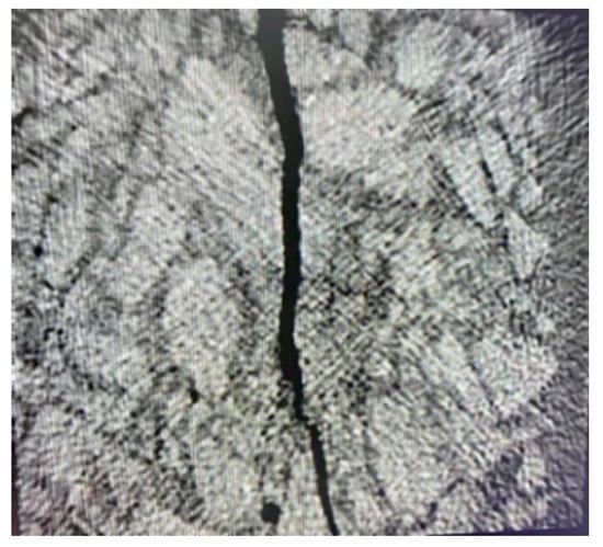 It can be seen from the impact images of the vault that the direction of the impact crack of 20 kg (Figure 16) is relatively single, multiple cracks longitudinally paralleled to the impact direction are distributed in the middle of the sample, and there are basically no transverse cracks. In the 30 kg impact image (Figure 17), there are more bifurcations at the upper and lower ends of the main crack. The 40 kg impact has an obvious transverse crack (Figure 18). In addition to the longitudinal transverse main crack, the small gap between aggregate and aggregate is distributed on the left and right sides of the sample, indicating that the shock wave caused visible damage to the interface transition zone of the aggregate and aggregate in this sample.