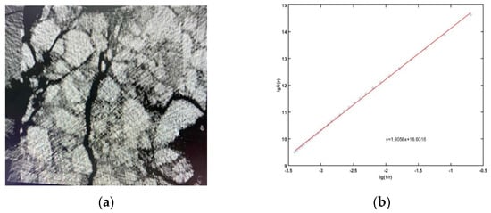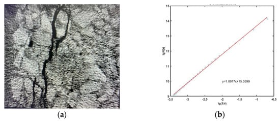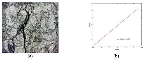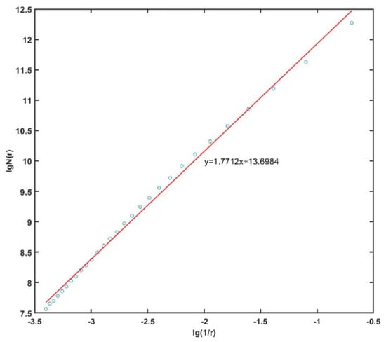 where is the area of the chosen box, and is the total number of the boxes that cover the crack in the picture. For the change in r caused by different box sizes (s), the least-squares method can be used to fit it. The vertical axis is , where is the number of boxes; the horizontal axis is , where r is the ratio of the side length of the box and this gray image. The slope of the fitting curve is the corresponding fractal dimension (D) (Figure 15).