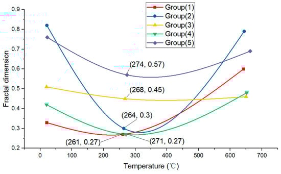 The results shown in Figure 19 indicate that the fractal dimension was not linear proportional to the temperature. In the process of increasing the temperature, the fractal dimension became lower at a temperature around 300 °C, which may have been caused by the increase in small cracks that may homogenize the concrete geometry at the mesoscale. After the temperature continuously increased to 650 °C, the cracks became more complex and obvious, which the fractal dimensions increased to a higher level.