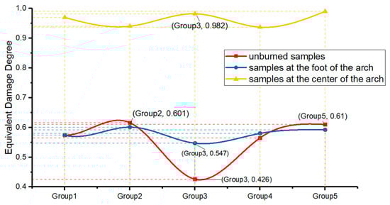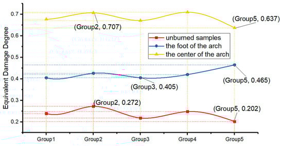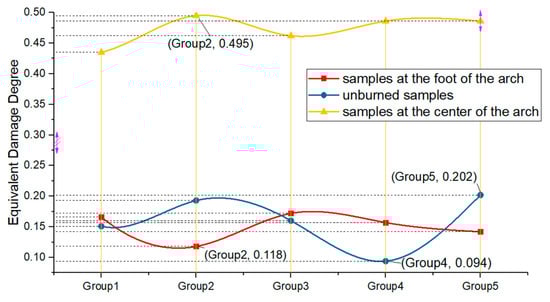 From Figure 20, it can be seen that the unburned samples had nearly the same damage degrees as the samples from the foot of the arch (0.094–0.202). The reason for this is that the temperature (around 265 °C) is not high enough to trigger the full dehydration of C-S-H in concrete material. A 20 kg impact apparently did not induce too much damage to the structure of the foot of the arch; when the temperature increased to 650 °C (at the center of the arch), it was clear that even with the same 20 kg impact, the damage degree increased significantly (around 0.7). This means that when the shock wave is attenuated in the tunnel (away from the explosion over 15 m), most of the damage area will be the celling of the tunnel, as this area has the highest temperature.