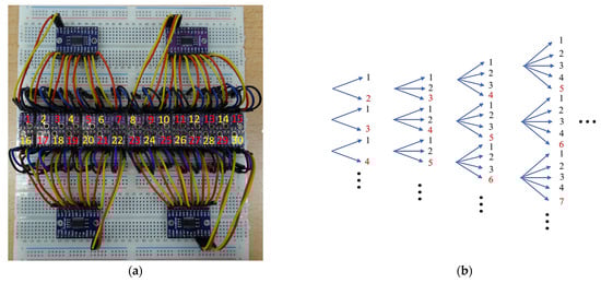 Each monitoring system included 30 of the following sensors: BMP180, BMP280, DHT22, SHT21 and SHT35. To provide a better understanding of the proposed methodology (statistical reference as well as combinatorial analysis), Figure 2a,b are presented. Figure 2a depicts the defined order/label of the installed sensors for each of the five monitoring systems in the written algorithm. The statistical reference of each monitoring system comes from the mean value of the associated 30 sensors. Figure 2b demonstrates the order of the sensor’s selection for combinatorial analysis, ranging from 1 to 8 out of 30 sensors. Through this combinatorial analysis, all the possible sensor arrangements will be chosen and compared with the associated statistical reference.