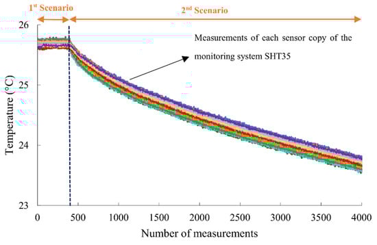 After applying the algorithm of Section 2.2.1 for sensor data reading, the ambient temperatures of each sensor was recorded. Figure 6 plots the evolution of the temperature recorded by each of the 30 copies of sensor SHT35 obtained in the corresponding data acquisition system. This figure clearly demonstrates the synchronised measurements of the SHT35 sensors to identify the laboratory temperatures in the two studied scenarios.