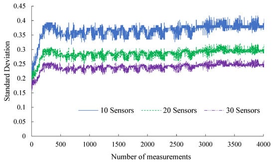 Standard deviation (SD) is a measure to determine the dispersion of data relative to its average value where a higher range of this parameter presents a higher uncertainty of measurements. Figure 8 studies the impact of increasing number sensors on variation of SD, randomly for one of the monitoring systems, DHT22. To do so, this figure plots the ranges of the SD when the number of sensors was increased between 10 and 30 units. In this figure, the vertical axis refers to the obtained SD, while the horizontal one refers to the measurements taken in the test.