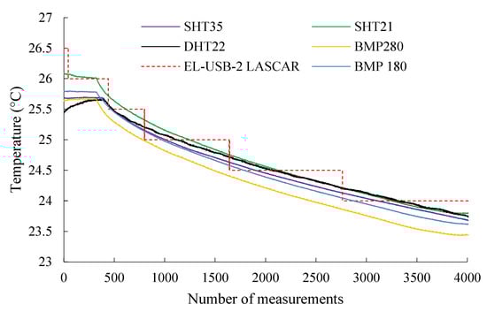 This paper studied the five most commonly used sensors, as shown in Table 2 (BMP180, BMP280, DHT22, SHT21 and SHT35). The chosen sensors for establishment of the five monitoring systems have different characteristics in terms of the accuracy, response time, communication protocol, and cost. The accuracies of these sensors range between 0.2 °C (SHT35) and 2 °C (BMP180), while their prices range between EUR 3.59 (BMP280) and EUR 5.76 (SHT35). The sensors studied are based on different communication protocols. For example, the sensor DHT22 uses a single wire/bus, while BMP180, SHT21 and SHT35 operate with the inter-integrated circuit protocol, I2C, and sensor BMP280 uses both I2C and the serial peripheral interface (SPI) [].