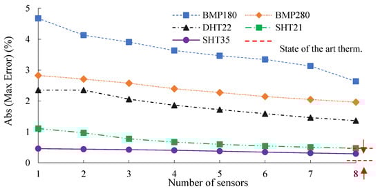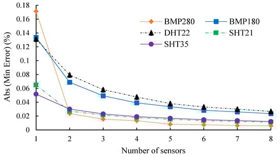 The analysis of Figure 15 illustrates how increasing the number of sensors reduces the minimum errors significantly. This beneficial effect can be observed in the BMP280 monitoring system, as its minimum absolute error is reduced from 0.17 °C for one sensor to 0.006 °C for eight. Figure 15 additionally shows that the most accurate single low-cost sensors SHT21 (0.06 °C) and SHT35 (0.05 °C) are more accurate than the most accurate commercial thermometer (EXTECH EN510 (0.1 °C)).