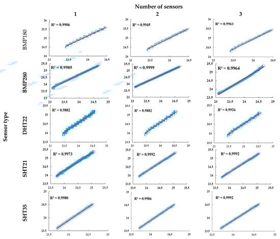 Information presented in Table 7 shows that the total costs of the proposed monitoring systems are EUR 58.8 for SHT35 and EUR 92.1 for SHT21. These costs are similar to commercial alternatives presented in the Table 5 with 0.5 °C accuracy (such as EL-USB-2 LASCAR (EUR 50 to 100)) and lower than other thermometers with the same accuracy (such as FLUKE 971 (EUR 350 to 500)). The assembling and programming cost of the monitoring system is not included in Table 7. Depending on the sensor type, the time is 10 min on average per sensor. Coefficient of variation () of the linear regression line between sensor measurements and reference data has been frequently used in the literature to verify the linearity of responses of low-cost sensors [,]. In other words, this parameter illustrates how well the measurements of studying sensors agree with the reference values, according to a regression module. A higher R-squared presents an increase in precision of the regression model. This analysis was carried out for the most inaccurate sensor arrangements and is summarized in Figure 14, where the pairwise correlation between sensor measurements and the associated statistical reference for an increasing number of sensors (ranging from one to three) are presented. According to Table 4, the most inaccurate sensor arrangements associated with combinations of one, two, and three units of sensors were selected among from 30, 435, and 4060 possible configurations, respectively. Evaluating the accuracy, the mean value of and individual sensor arrangement were compared with the associated statistical reference. For the combination of each number of sensors, the dependent (sensor data) and independent (statistical reference data) variables were plotted in Figure 14 on the vertical and horizontal axis, respectively. Comparison of values in an individual sensor set demonstrates how effective it is to increase the number of sensors. According to Figure 14, DHT22 provides the lowest linearity for the combination of all the studied number of sensors. For instance, for the case of one sensor, is equal to 0.9882 and reaches 0.9926 when the number of sensors is increased to three. However, when considering a number of sensors up to three, sensors SHT21 and SHT35 provided the best results, as was obtained. Further assessment of the sensors in this figure also proves that the correlation of BMP180 pressure sensors with the associated statistical reference is strong, as the range of was obtained when the number of sensors was increased from one to three.
