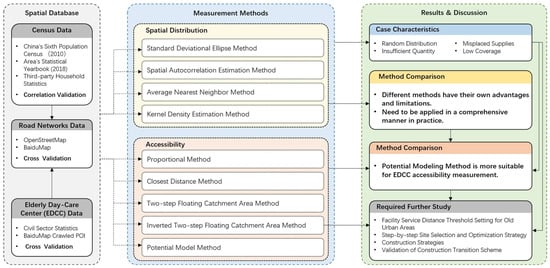 This study aims to provide a theoretical basis and methodological support for the planning and renovation of EDCCs in China’s urban built-up areas by examining the spatial distribution and accessibility measurement methods. Firstly, we investigated the EDCCs for the elderly in Nankai District, Tianjin, and obtained the basic construction data of EDCCs and the data of residences in Nankai District and the surrounding communities. After that, we combined the road network data to construct the database of “EDCCs—residences”. Then, the standard deviation ellipse (SDE), spatial autocorrelation (SA), average nearest neighbor (ANN), kernel density estimation (KDE), and buffer zone methods were used to comprehensively evaluate the spatial distribution characteristics of EDCCs in the region. The accessibility was analyzed and compared by the proportional method, the nearest distance method, the two-step floating catchment area method (2SFCA), the inverted two-step floating catchment area method (i2SFCA), and the potential model method. The results show the emphases of different spatial distribution algorithms and their limitations. Regarding 2SFCA and the potential model, the latter demonstrated more advantages for the analysis of this scenario. The threshold setting of public facilities’ service distances for the urban built-up areas in the current standard requires further exploration. The analysis results also confirmed that the number of existing EDCCs in Nankai District is severely small, the distribution is random, and a spatially mismatch in supplies with the distribution of the elderly population exists. Finally, the principles and strategies for planning and optimization of EDCC are presented based on the analysis (