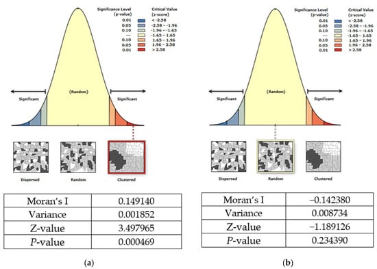 In this study, the correlation between the spatial distribution of EDCCs and their area of location was analyzed by ArcGIS using the global Moran’s I (the value is generally between −1 and 1). The closer the absolute value of Moran’s I is to 1, the stronger the correlation is. When the index is 0, it indicates that the study objects are randomly distributed in space; when close to +1, it indicates the existence of spatial aggregation; and when close to −1, it indicates spatially discrete distribution. Thus, the spatial clustering model of facilities could be expressed [