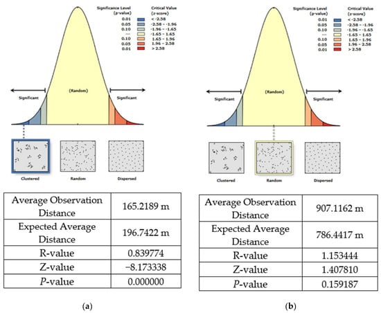 In ArcGIS, when the resulting R-value (ratio of ANN) is 1, the facilities are randomly distributed. If it is less than 1, the facilities are relatively close to each other in space and have a spatially clustered distribution. If it is greater than 1, the spatial distribution shows a dispersed or competing distribution pattern.