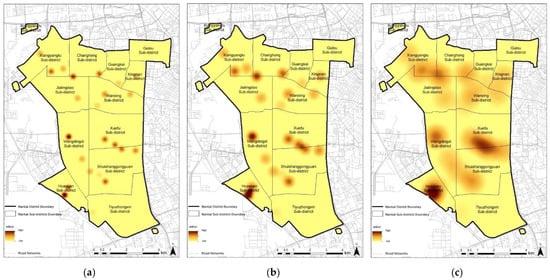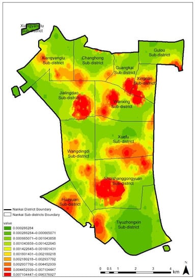 A KDE is a spatial analysis in which the densities of elements in their domains are calculated and visualized. The method calculates the density of elements in the analysis of points around a single pixel, each of which has a smooth surface. The value is highest at the position of the point of interest (POI). As the distance from the POI location increases, the value gradually decreases and the connection with the facility decreases. The density distribution within the study area is then obtained by superimposing the densities at the same locations and generating a gridded graph. Within the search radius
