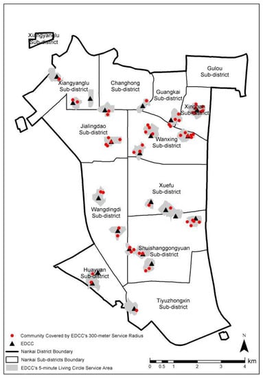 Table 2). The Standard stipulates that a 5 min pedestrian scale neighborhood should include EDCCs, and the services’ distances should not exceed 300 m.