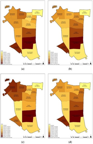 The analysis results show that the accessibility of Shuishanggongyuan and Huayuan sub-districts is higher than that of other sub-districts. Gulou sub-district has the lowest accessibility in the entire district. Other sub-districts showed no significant changes in the accessibility results for the four indicators during the analysis. Xiangyanglu and Jialingdao sub-districts showed increased accessibility in the measurement of the population served. The reason for this is that the EDCCs in these two sub-districts are mostly installed in nursing homes, and the number of served is calculated as in institutional nursing facilities. This is one of the advantages of the joint construction of EDCC and institutional elderly care centers.