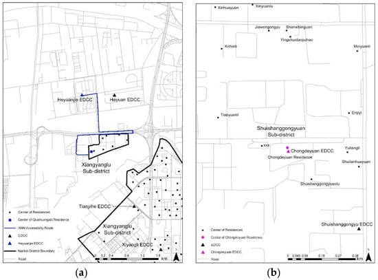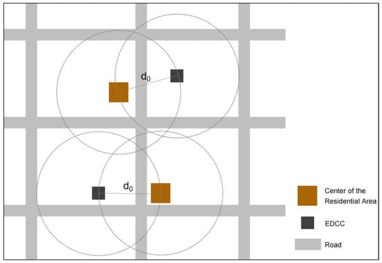 In this study, the “Origin–Destination (OD)” cost matrix was established in ArcGIS. The starting point is the residential site of the community (usually at the community gate or center of mass), the EDCC is the destination, the impedance is set as the length of the road, the limit travel distance is 300 m, the scale of the facility is the area of the EDCC, and the scale of the demand point is the number of households in the community.