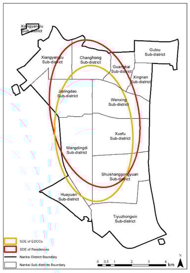 Table 7), the SDE flat rate of EDCCs is larger than that of residences. The direction of EDCCs distribution is obvious, and the degree of dispersion is larger. By comparing the SDE areas of them, the area of residences is larger than that of EDCCs, indicating that the distribution of facilities does not cover all residences (