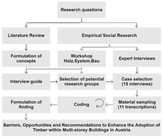 Many studies have been run in order to test the technical properties of timber building elements and systems for multi-storey buildings [,,], others to develop comparative surveys of buildings to investigate structural systems [] and emerging architectural typologies [], and others focused on manufacturing or automation [,]. Still, there is a research gap and a lack of literature about specific definition of design and construction processes with their enablers and hurdles. This research bridges this gap, focusing on multi-storey timber-based buildings of up to six storeys, according to the building classes stipulated in Austrian fire regulations []. The innovative contribution of this study relies on the investigation of their state-of-the art in Austria, analysing their specific design and construction processes, identifying barriers and opportunities to their widespread implementation, and formulating recommendations for their assessment. In the first section, the research design and methodical process are described. The second part examines the state-of-the art and research on design and production processes of multi-storey timber buildings based on the literature review. Next, the methodical approach of the collection and analysis of the data within the expert interviews are presented. Then, the findings are revealed and validated through triangulations. Based on this, recommendations to overcome the barriers identified making advantage of the highlighted opportunities are formulated. Finally, the results and the recommendations are discussed, and in the conclusion section, the content of the paper is summarised.