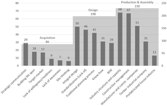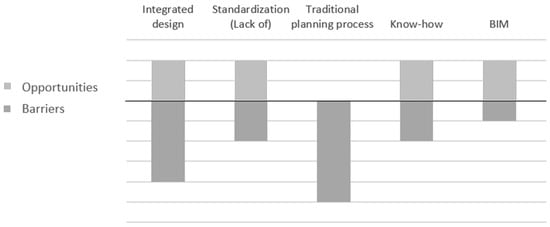 According to the frequency of nominations accounted within the three categories and their embedded codes, the Production and Assembly stage represents the most discussed one, with almost half of the total nominations, whereby the proportion of barriers and opportunities are equal, showing great concerns but also strengths and relevant potentials. Further, the Design stage accounts around one-third of all nominations, with a ratio of opportunities to barriers of 1:2. The design stage has huge impacts both in the production and assembly stage due to the prefabrication and its higher detail definition, and in the acquisition stage due to the higher complexity and lack of expertise. Therefore, the limitations and opportunities here identified require great attention, having the potential to heavily influence their correlated stages. Finally, the Acquisition stage englobes one-sixth of the nominations, where the number of limitations is three times the number of opportunities. Although this stage represents the least-discussed stage, it also accounts for the worst proportion of limitations to opportunities, with barriers creating enormous repercussions on the whole process and affecting the entire industry. Therefore, it is a crucial stage demanding great awareness.