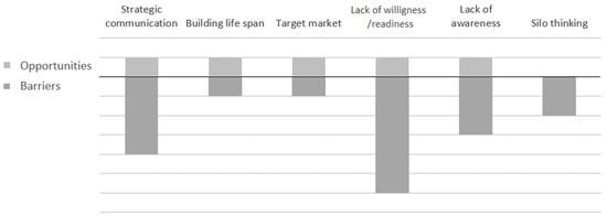In this section, phenomena occurring within the acquisition or demand phase are presented, implying two main targeted groups, decision makers and society. An adequate strategic communication is urgently needed to overcome the prejudices and preconceptions commonly found in the sector and society, and to promote the use of timber by communicating its hard and soft benefits to decision makers and citizens. Unique high-rise projects gain attention, but more conventional mid-rise projects are needed to become standard. Their public documentation would enhance cooperation and openness, overcoming silo thinking and promoting new construction methods and building materials. The six codes allocated in this category with their embedded 22 sub-codes and their assigned character are represented in Table 4 and described in detail in the following subsections. Figure 4 shows the relation of barriers and opportunities corresponding to the sub-codes allocated in each code; three times more barriers than opportunities were identified. A lack of willingness and readiness englobe the greatest barriers, followed by a lack of strategic communication and a lack of awareness.