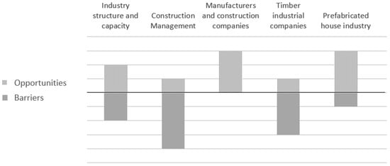 Great concerns regarding the lack of strategic communication were reported, including not only the dissemination of economic long-term benefits of timber buildings, but also those related to systemized construction methods, such as the potential implementation of circular design, the optimization of planning and execution processes and the reduction in time and costs []. Quality and costs are key topics when starting a project, and there exist too little experience and knowledge. Although the number of timber buildings has increased in recent years, further reference and standard projects with their corresponding documentation are needed to obtain key data for the calculations and examples for planning. There exists an appreciable awareness about the ecological benefits of timber and about using sustainable and renewable materials within the sector and society that support the realisation of these buildings. Regarding to the costs, the unfeasibility of communicating unmeasurable benefits was identified, such as those related to more net floor area and lower overall building height due to thinner building elements, or long-term health benefits and well-being effects. Another barrier mentioned was the public image of fragile structure of the industry based on its fragmentation, the reduced number of qualified players, the lack of cooperation and the number of possible solutions due to own specific “in-house” developments. This lack of cohesion leads to no representatives in the politics nor association with influence on regulations or in the promotion for standardisation.