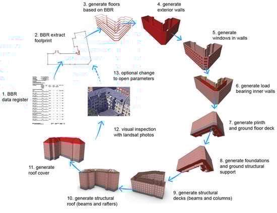 - Generate a complete 3D model of essential building elements through the 11 steps shown in Figure 1; foundations, load-bearing walls, load-bearing decks and roof structures for a given typology based on definitions and rules defined by Engelmark and input from BBR implemented with the least amount of free parameters.
