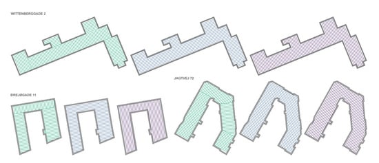 - Wittchen, K.B.; Kragh, J. Danish Building Typologies; SBi, Statens Byggeforskningsinstitut: Hørsholm, Denmark, 2012. [Google Scholar]
