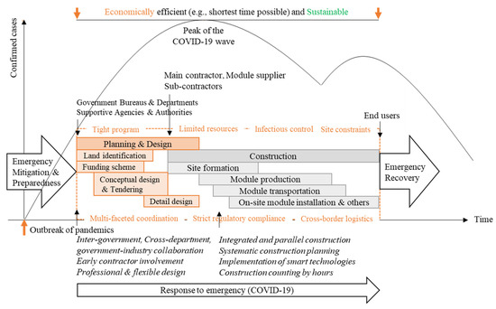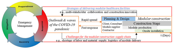 To explore the challenges and strategies of using modular construction for COVID-19, it is necessary to first examine the concept, principles and process of emergency project delivery and management. Emergency management is to apply science, technology, planning, and management to deal with extreme events that can cause extensive property damage and disrupt community life [25]. It addresses how humans and institutions interact and cope with hazards through a cycle with four major activities, i.e., mitigation, preparedness, response, and recovery [26,27]: mitigation includes actions taken to prevent or reduce the impact and consequences of disasters; preparedness involves planning and training activities for events that cannot be mitigated; response includes activities designed to address the immediate and short-term effects of an emergency or disaster; and recovery refers to long-term activities designed to return all systems to normal status. “Build Back Better” principles are normally introduced as an ideal reconstruction/recovery process to improve community’s resilience following a disaster event, e.g., improved building codes and land-use plans [28]. This study focused on the emergency response, i.e., how modular construction contributes to the efficient response to the outbreak of COVID-19 through fast delivery of healthcare facilities.