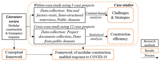 This research has adopted a multi-case study strategy using 12 case projects, and was carried out following the process shown in Figure 2. To start, a comprehensive literature review was conducted, and a conceptual framework was developed. Guided by the conceptual framework, a within-case study using 5 cases was conducted to identify and validate the challenges and strategies of using modular construction for addressing COVID-19; in parallel, a cross-case study using 12 cases was conducted to measure the performance of modular construction for healthcare project delivery. Based on the multi-case studies, the performance (e.g., time and cost efficiency) of modular healthcare facilities was evaluated, and the framework of modular construction-enabled efficient response to COVID-19 was developed.
