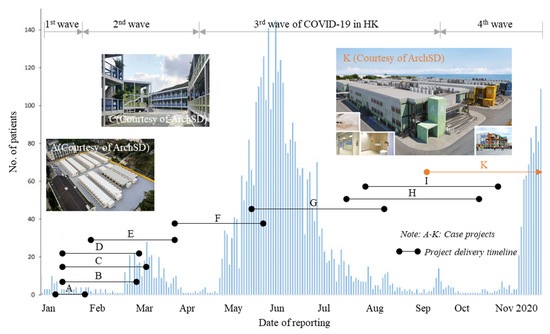 From Figure 3, it can be seen that all quarantine camps using modular construction were delivered within 3 months, and the design and construction of the modular hospital were completed within 4 months from the 4th quarter of 2020 to the 1st quarter of 2021. To accommodate the people who needed isolation (e.g., visitors from overseas), there was an urgency to deliver quarantine camps (e.g., Projects A to F) with sufficient beds as soon as possible since the outbreak of the pandemic. To address the future waves of the pandemic, it was also critical to build more isolation facilities for the locally confirmed cases, e.g., Projects G to I. In addition, to release the pressure of both the public and private hospital systems, a temporary hospital (Project K) was delivered between the peak of the 3rd and 4th waves, which provided both isolation and curing facilities. The rapid delivery of these facilities facilitated a timely response to the 4 waves of the pandemic in 2020.