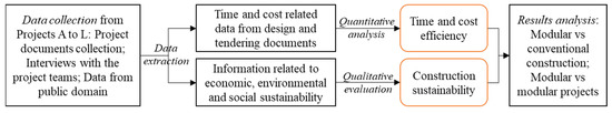 The cross-case study was conducted using 12 case projects with both quantitative and qualitative analyses (Figure 4). First, an Excel table was used to quantitatively measure the construction efficiency, followed by a comparative analysis using a scatter plot. Construction project efficiency is normally measured using time- and cost-efficiency [42]. The following equations were used: (1) Time efficiency (m2/day) = CFA/Duration of project delivery; and (2) Cost efficiency (m2/$) = CFA/Cost of project development. The ‘CFA’ refers to the total construction floor area and was extracted from architectural drawings; ‘Duration of project delivery’ covers project design and construction and was extracted from the master program; and ‘Cost of project development’ is the contract sum approved by a client and was collected from public domain. Second, qualitative evaluation was conducted to comprehensively reflect the performance of modular construction in response to COVID-19. To enable like-to-like comparison, only projects of the same type were compared with each other, e.g., modular quarantine camp vs. conventional quarantine camp. The information was mainly collected from the project teams (e.g., design and construction documents) and public domain (e.g., government website and reports of public seminars), and analyzed under the three pillars of sustainability: economy, environment, and society.