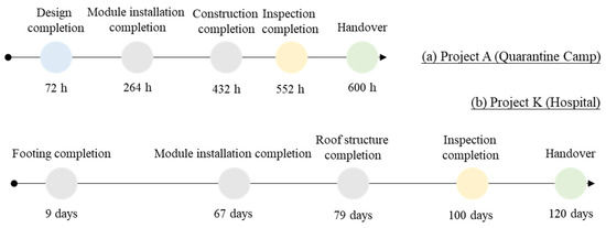 To cater for the urgent social needs, all case projects adopted a 24-h working arrangement both on sites and in factories, with the principle of counting by hours. To ensure construction efficiency in such a tight program, systematic planning was conducted by the project teams both on site and in the factory. For example, the schedule and timeline of module delivery and installation were designed by minutes in Projects A and B. Modules were transported during nighttime and were installed successively from midnight to the early morning. The ‘counting by hours’ working arrangement made it possible for timely and fast project delivery (Figure 6), e.g., Project A was completed in 600 h and Project K in 120 days providing over 800 beds.